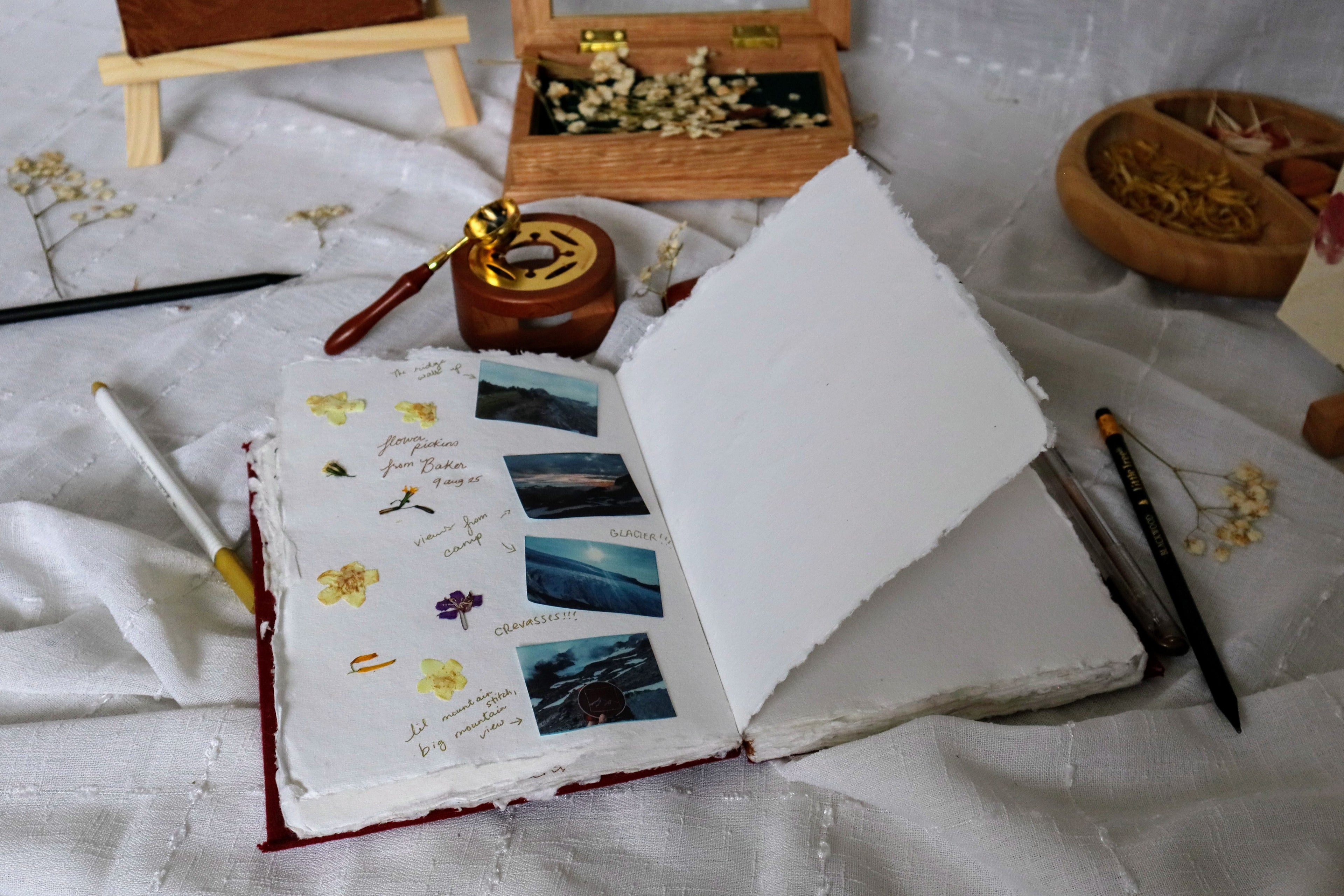 The pages are made from 100% recycled, handmade cotton paper; the bindings are sewn with natural thread; the covers are wrapped in pure cotton or reclaimed fabrics, each imbued with its own quiet history. Every detail, from paper grain to stitch, is selected with intention — to honor sustainability and the artistry of the handmade.